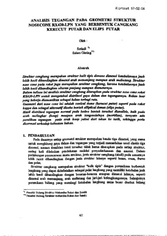Struktur cangkang merupakan struktur kulit tipis dimana dimensi ketebalannya jauh lebih kecil dibandingkan dimensi arah memanjang maupun arah melintang. Struktur nose cone pada roket juga merupakan struktur cangkang, karena ketebalannya fault lebih kecil dibandingkan ukuran panjang maupun diameternya. Dalam tulisan ini analisis struktur cangkang diterapkan pada struktur nose cone roket RX420-LPN untuk mengetahui distribusi gaya dalam dan tegangannya. Beban luar yang bekerja diasumsikan sebagai beban terbagi rata. Geometri dari nose cone ini adalah conical dome (kerucut putar) seperti pada roket kappa dan sebagai alternatif dicoba bentuk elliptical domes (dips putar).Hasil diStribusi tegangan normal pada kedua bentuk tersebut dianalisis, baik pada arah melingkar (hoop) maupun arah tangensialnya (meridian), ternyata ada peralihan tegangan pada arah hoop yakni dari tekan ke tarik, sehingga perlu dicermati terhadap kekuatan bahan.