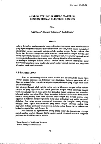 Adanya kebutuhan analisa material yang makin akurat menuntut suatu metoda analisis yang dapat menganalisa struktur mikro secara lebih teliti dan presisi. Dalam makalah ini disampaikan secara sistematik metoda-metoda analisa dengan berkas elektron dan berkas ion. Selain itu disampaikan pula beberapa contoh analisis dengan metoda yang sering digunakan berdasarkan keuntungan-keuntungan dan problematika yang ada untuk memperoleh informasi lengkap tentang material yang dianalisa. Dengan adanyaperbandingan beberapa metoda analisa struktur mikro tersebut diharapkan dapat memberikan gambaran yang mudah dan cepat tentang metoda-metoda apa yang akan digunakan untuk analisis material