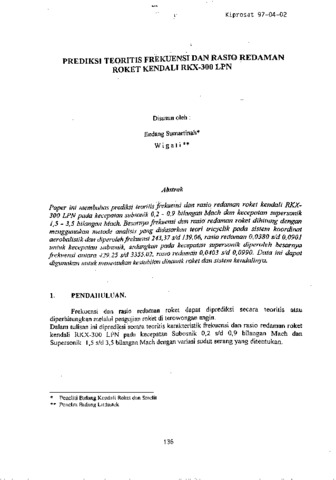 Paper ini membahas prediksi teoritis frekuensi dan rasio redaman roket kendali RKX¬300 LPN pada kecepatan subsonik 0,2 - 0,9 bilangan Mach dan kecepatan supersonik 1,5 - 3,5 bilangan Mach. Besarnya frekuensi dan rasio redaman roket dihitung dengan menggunakan metode analisis yang didasarkan teori tricyclik pada sistem koordinat aerobalistik dan diperoleh frekuensi 243,37 s/d 139,06, rasio redaman 0,0380 s/d 0,0901 untuk kecepatan sedangkan pada kecepatan supersonik diperoleh besarnya frekuensi antara 429.25 s/d 3355,02, rasio redaman 0,0403 s/d 0,0990. Data ini dapat digunakan untuk menentukan kestabilan dinamik roket dan sistem kendalinya.