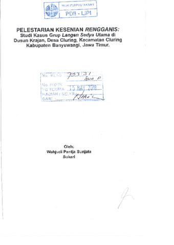 Wahjudi Pantja Sunjata and Sukari (2017) Pelestarian kesenian Rengganis: Studi kasus grup Langen Sedya Utama di Dusun Krajan, Desa Cluring, Kecamatan Cluring, Kabupaten Banyuwangi, Jawa Timur. Balai Pelestarian Nilai Budaya (BPNB), Yogyakarta. ISBN 978-979-8971-76-1