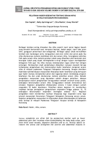Oon, Sopiah and Nelly, Apriningrum and Citra, Resita and Uway, Wariah (2022) Pelatihan kader kesehatan tentang senam nifas di wilayah Kabupaten Karawang. Jurnal Kreativitas Pengabdian kepada Masyarakat, 5 (10): 4. pp. 3276-3286. ISSN 2615-0921