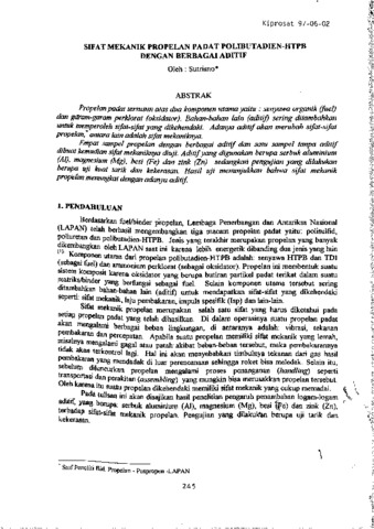 Propelan padat tersusun alas dua komponen utama yaitu : senyawa organik (fuel) dan gararn-garam perklorat (oksidator). Bahan-bahan lain (aditif) sering ditambahkan untuk memperoleh sifat-sifat yang dikehendaki. Adanya aditif akan merubah sifat-sifat propelan, antara lain adalah sifat mekaniknya.Empat sampel propelan dengan berbagai aditif dan satu sampel tanpa aditif dibtiat kemudian sifat mekaniknya diuji. Aditif yang digunakan berupa serbuk aluminium (Al), magnesium (Mg), besi (Fe) dan zink (Zn) sedangkan pengujian yang dilakukan berupa uji kuat tarik dan kekerasan. Hasil uji menunjukkan bahwa sifat mekanik propelan menungkat dengan adanya aditif.