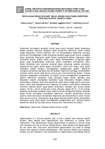 Patwa, Amani and Donna, Adriani and Mustika, Anggiane Putri and Yudhisman, Imran (2022) Penyuluhan risiko penyakit ginjal kronis pada pasien hipertensi prolanis putewa Jakarta Timur. Jurnal Kreativitas Pengabdian kepada Masyarakat, 5 (10): 5. pp. 3287-3295. ISSN 2615-0921