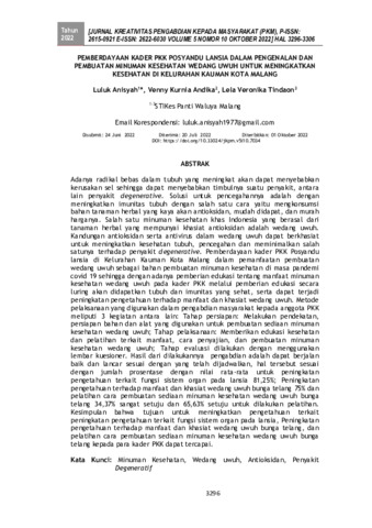 Luluk, Anisyah and Venny, Kurnia Andika and Lela, Veronika Tindaon (2022) Pemberdayaan kader PKK Posyandu Lansia dalam pengenalan dan pembuatan minuman kesehatan wedang uwuh untuk meningkatkan kesehatan di Kelurahan Kauman Kota Malang. Jurnal Kreativitas Pengabdian kepada Masyarakat, 5 (10): 6. pp. 3296-3306. ISSN 2615-0921