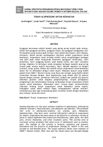 Surtiningish, Surtiningish and Linda, Yanti and Feti, Kumala Dewi and Fauziah, Hanum and Arlyana, Hikmanti (2022) Terapi acupressure untuk kesehatan. Jurnal Kreativitas Pengabdian kepada Masyarakat, 5 (10): 8. pp. 3316-3324. ISSN 2615-0921