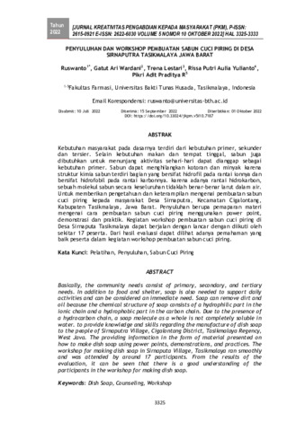 Ruswanto, Ruswanto and Gatut, Ari Wardani and Trena, Lestari and Rissa, Putri Aulia Yulianto and Pikri, Adit Praditya R (2022) Penyuluhan dan workshop pembuatan sabun cuci piring di Desa Sirnaputra Tasikmalaya Jawa Barat. Jurnal Kreativitas Pengabdian kepada Masyarakat, 5 (10): 9. pp. 3325-3333. ISSN 2615-0921