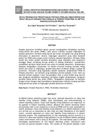 Eny, Septi Wulandari Dwi Prihatin and Apri, Nur Wulandari (2022) Upaya peningkatan pengetahuan tentang perilaku hidup bersih dan sehat melalui ceramah pada remaja di Pondok Pesantren Al-Miftah Nanggulan Kulon Progo. Jurnal Kreativitas Pengabdian kepada Masyarakat, 5 (10): 11. pp. 3354-3362. ISSN 2615-0921