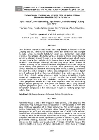 Iqbal, Firdaus and Simon, Sembiring and Agus, Riyanto and Rudy, Situmeang and Pulung, Karo Karo (2022) Pendampingan pengelolaan website Desa Hajimena sebagai penunjang program digitalisasi desa. Jurnal Kreativitas Pengabdian kepada Masyarakat, 5 (10): 14. pp. 3387-3396. ISSN 2615-0921