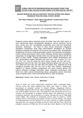 Wuri, Ratna Hidayani and Hesti, Adzani Ramadhanti and Imelda, Sintya and Ranti, Nurqolbi (2022) Edukasi kesehatan melalui Whatsapp tentang deteksi dini anemia kehamilan pada ibu hamil di Desa Cikunir. Jurnal Kreativitas Pengabdian kepada Masyarakat, 5 (10): 16. pp. 3408-3417. ISSN 2615-0921
