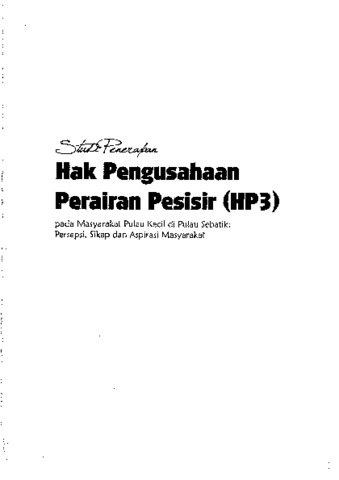 Masyhuri Imron and Ary Wahyono and Ahmad Solihin (2010) Studi penerapan Hak Pengusahaan Perairan Pesisir (HP3) pada masyarakat Pulau Sebatik: Persepsi sikap dan aspirasi masyarakat. LIPI Press, Jakarta. ISBN 978-979-799-578-2