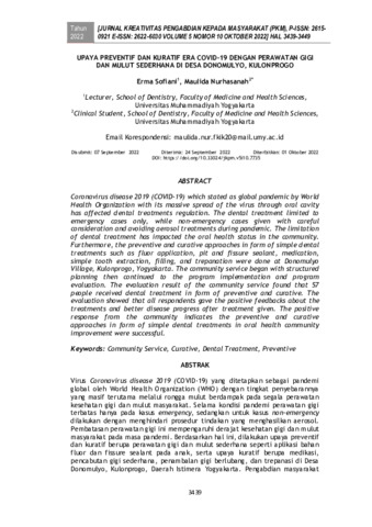 Erma, Sofiani and Maulida, Nurhasanah (2022) Upaya preventif dan kuratif era Covid-19 dengan perawatan gigi dan mulut sederhana di Desa Donomulyo, Kulonprogo. Jurnal Kreativitas Pengabdian kepada Masyarakat, 5 (10): 19. pp. 3439-3449. ISSN 2615-0921