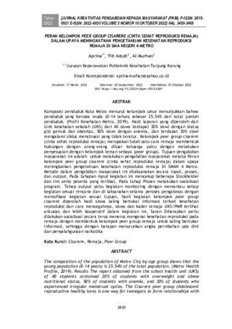 Aprina, Aprina and Titi, Astuti and Al, Murhan (2022) Peran kelompok peer group Cisarere (cinta sehat reproduksi remaja) dalam upaya meningkatkan pengetahuan kesehatan reproduksi remaja di SMA Negeri 4 Metro. Jurnal Kreativitas Pengabdian kepada Masyarakat, 5 (10): 20. pp. 3450-3469. ISSN 2615-0921