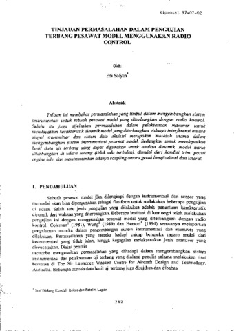 Tulisan ini membahas permasalahan yang timbul dalam mengembangkan sistem instrumentasi untuk sebuah pesawat model yang diterbangkan dengan radio kontrol. Selain itu juga dUelaskan permasalahan dalam pelaksanaan manuver untuk mendapatkan karakteristik dinamik model yang diterbangkan. Adanya interferensi antara sinyal transmitter dan sistem data akuisisi merupakan masalah utama dalam mengembangkan sistem instrumentasi pesawat model. Sedangkan untuk mendapatkan hasil data uji terbang yang dapat digunakan untuk analisa dinamik, model harus diterbangkan di udara tenang (tidak ada turbulen), dimulai dari kondisi trim, posisi engine idle, dan meminimumkan adanya coupling antara gerak longitudinal dan lateral.