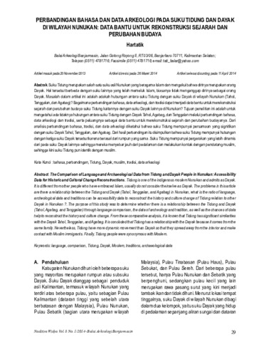 Hartatik (2014) Perbandingan bahasa dan data arkoelogi pada suku Tidung dan Dayak di wilayah Nunukan: data bantu untuk rekonstruksi sejarah dan perubahan budaya. Naditira Widya, 8 (1): 4. pp. 29-48. ISSN 1410 - 0932
