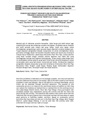 Fitri, Wahyuni and Rini, Rahmayanti and Delvi, Hamdayani and Hidayatul, Hasni and Velga, Yazia and Ises, Reni and Mitakheny, Megalasa and Diva, Shelfioni Wilanda and Sasmi, Sasmi (2022) Edukasi masyarakat khususnya ibu balita dalam mencegah terjadinya masalah gizi pada anak dengan pendekatan terapi pijat tuina. Jurnal Kreativitas Pengabdian kepada Masyarakat, 5 (10): 28. pp. 2543-3556. ISSN 2615-0921