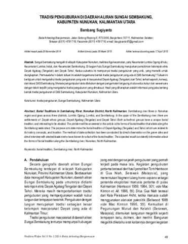Sungai Sembakung mengalir di wilayah Kabupaten Nunukan, melintasi tiga kecamatan, yaitu Kecamatan Lumbis Ogong di hulu, Kecamatan Lumbis Induk, dan Kecamatan Sembakung. Di bagian hulu Sungai Sembakung merupakan pemukiman kelompok etnis Dayak Agabag (Tengalan) dan Dayak Tahol. Kedua subetnis ini mempunyai tradisi penguburan yang unik, yang menarik untuk diungkapkan. Permasalahan dalam tulisan ini adalah bagaimana bentuk tradisi penguburan yang ada di DAS Sembakung? Tulisan ini bertujuan untuk mengetahui tradisi penguburan yang ada di masyarakat Dayak Agabag (Tengalan) dan Tahol, terkait sejarah, konsep, dan lokasi DAS Sembakung. Metode pengumpulan data dilakukan dengan pengamatan langsung di situs-situs kubur dan wawancara dengan tokoh terpilih yang mengetahui tradisi penguburan yang dimaksud. Hasil yang diharapkan adalah informasi yang jelas tentang bentuk tradisi penguburan di DAS Sembakung, Kabupaten Nunukan, Kalimantan Utara.