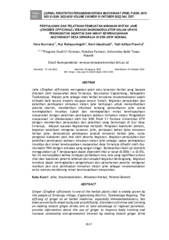 Vera, Nurviana and Nur, Rahayuningsih and Keni, Idacahyati and Yadi, Aditya Prawira (2022) Penyuluhan dan pelatihan pembuatan minuman instan jahe (Zingiber officinale) sebagai imunomodulator dalam upaya peningkatan imunitas dan minat kewirausahaan masyarakat Desa Sirnaraja di era pandemi. Jurnal Kreativitas Pengabdian kepada Masyarakat, 5 (10): 29. pp. 3557-3566. ISSN 2615-0921
