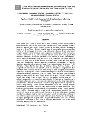 Pada Sabtu (14/12/2021) pukul 15.20 WIB, Gunung Semeru memuntahkan endapan magma dari dalam perut bumi. Larutan silika bersuhu tinggi terbang bersama kepulan asap tebal hingga meluas ke berbagai penjuru Kabupaten Lumajang, Jawa Timur. Dengan kondisi seperti itu mengharuskan masyarakat sekitar untuk mengungsi di tempat yang lebih aman. Berada dalam satu lokasi dengan ratusan orang tentunya akan sangat memungkinkan untuk munculnya masalah kesehatan baru, salah satunya adalah alergi dan gatal-gatal. Hal tersebut mengingat minimnya penyediaan air bersih di lokasi pengungsian. Selain masalah kesehatan yang mengintai para pengungsi, tentunya masalah psikis juga bisa muncul dalam kondisi tersebut, tidak terkecuali bisa terjadi juga pada anak-anak. Bentuk kegiatan pengabdian masyarakat ini berupa kegiatan pendidikan kesehatan tentang Peningkatan Edukasi Kesehatan PHBS Melalui Story Telling. Sasaran pelaksanaan kegiatan ini seluruh anak-anak di tempat pengungsian mulai dari usia 3-12 tahun. Topik kegiatan yang dilakukan adalah tentang PHBS. PHBS atau personal hygiene merupakan bagian yang penting sebagai upaya dalam menjaga kesehatan tubuh. Melihat sasaran kegiatan yang merupakan kategori anak, oleh sebab itu diperlukan media yang tepat dalam pelaksaannya. Metode penyampaian edukasi yang dipilih dalam kegiatan ini adalah story telling. Story telling merupakan salah satu bentuk metode penyampaian informasi dengan cara mendongeng ataupun bercerita, bisa dilakukan secara berkelompok ataupun perseorangan (Listuayu, 2016). Metode story telling dianggap paling tepat untuk penyampaian edukasi hal itu mengingat dunia anak adalah dunia bermain, sehingga diharapkan dengan memberikan edukasi melalui story telling upaya untuk menyampaikan informasi bisa lebih mengena dan anak menjadi lebih antusias. Kesimpulan dari kegiatan ini Upaya peningkatan pengetahuan masyarakat terutama anak-anak tentang pentingnya menerapkan PHBS dalam menjaga kebersihan diri dapat lebih maksimal setelah diadakan kegiatan ini.