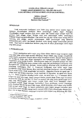 Untuk memperoleh konfigurasi rotor blade yang optimal untuk kondisi angin di Indonesia dikembangkan perangkat lunak perancangan turbine angin. Perangkat dikembangkan dengan mengacu pada power output dan kondisi angin sebagai input dan geometri blade sebagai output. Sebagai studi awal perancangan turbin, perancangan dilakukan dengan mengintroduksikan 3 tipe airfoil dan tiga tipe variasi sudut serang effektif sepanjang span sebagai variabel perancangan. Hasil perancangan yang diperoleh menunjukkan jenis airfoil dan bentuk distribusi sudut serang sangat menentukan prestasi turbin. Hasil basil ini memberikan landasan yang baik di dalam perancangan turbin angin yang lebih optimal.