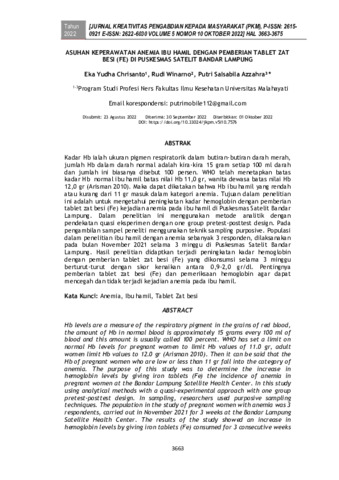 Eka, Yudha Chrisanto and Rudi, Winarno and Putri, Salsabila Azzahra (2022) Asuhan keperawatan anemia ibu hamil dengan pemberian tablet zat besi (Fe) di Puskesmas Satelit Bandar Lampung. Jurnal Kreativitas Pengabdian kepada Masyarakat, 5 (10): 38. pp. 3663-3675. ISSN 2615-0921