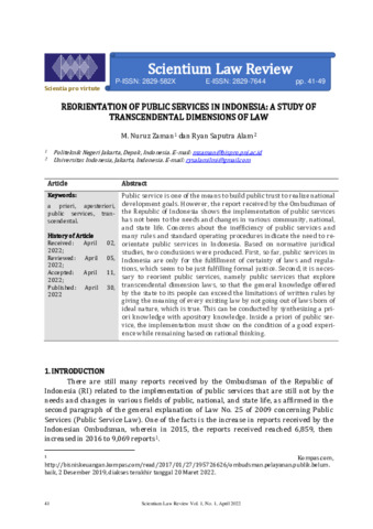 M, Nuruz Zaman and Ryan, Saputra Alam (2022) Reorientation of public services in Indonesia: a study of transcendental dimensions of law. Scientia Business Law Review, 1 (1): 5. pp. 41-49. ISSN 2829-582X