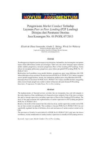 Elizabeth, Diani Samantha and Gindo, L. Tobing and Wiwik, Sri Widiarty (2022) Pengawasan market conduct terhadap layanan Peer to Peer Lending (P2P Lending) ditinjau dari peraturan otoritas jasa keuangan No. 01/POJK.07/2013. Jurnal Magister Hukum UKI NOVUM ARGUMENTUM, Volume 1 Nomor 1, April 2022, 1 (1): 2. pp. 13-21. ISSN 2830-3008