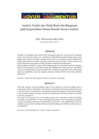 Mohammad, Aufar Sadat (2022) Analisis yuridis atas pajak bumi dan bangunan pada kepemilikan satuan rumah susun condotel. Jurnal Magister Hukum UKI NOVUM ARGUMENTUM, Volume 1 Nomor 1, April 2022, 1 (1): 6. pp. 57-71. ISSN 2830-3008