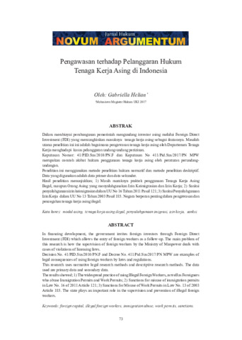 Gabriella, Helian (2022) Pengawasan terhadap pelanggaran hukum tenaga kerja asing di Indonesia. Jurnal Magister Hukum UKI NOVUM ARGUMENTUM, Volume 1 Nomor 1, April 2022, 1 (1): 7. pp. 73-83. ISSN 2830-3008
