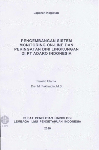 M, Fakhrudin (2010) Pengembangan sistem monitoring on-line dan peringatan dini lingkungan PT. Adaro Indonesia. Technical Report. Pusat Penelitian Limnologi, Cibinong. (Unpublished)