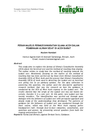Muslem, Hamdani (2022) Peran majelis permusyawaratan ulama aceh dalam pembinaan aliran sesat di Aceh Barat. Teungku: Jurnal Guru Nahdlatul Ulama Volume 1 Nomor 1 Maret 2022, 1 (1): 3. pp. 44-63. ISSN 2830-3148