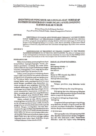 Telah dilakukan penelitian pengaruh arus pengelasan terhadap distribusi kekerasan sambungan las kelongsong dengan tutup kelongsong batang elemen bakar nuklir. Dalam penelitian ini ditemukan bahwa kekerasan daerah las yang lebih besar dari kekerasan kelongsongnya diperoleh untuk arus las 27 amper.