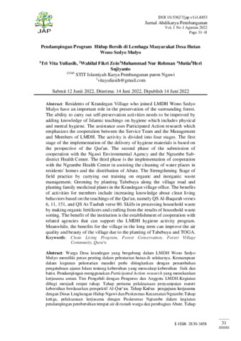 Tri, Vita Yuliasih and Wahilal, Fikri Zein and Muhammad, Nur Rohman and Mutia, Mutia and Heri, Sujiyanto (2022) Pendampingan program hidup bersih di lembaga masyarakat Desa Hutan Wono Sedyo Mulyo. Jurnal Abdikarya Pembangunan, Vol 1 No 1 Agustus 2022, 1 (1): 4. pp. 31-41. ISSN 2830-3458
