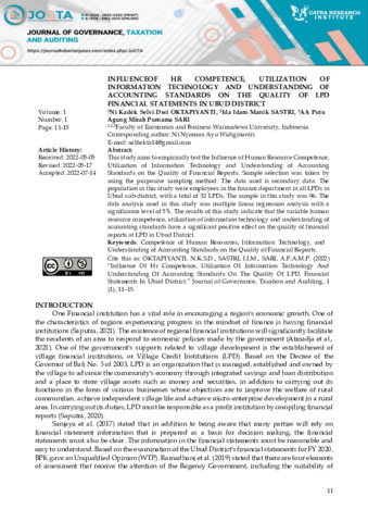 Ni Kadek, Selvi Dwi Oktapiyanti and Ida, Manik Sastri and Aa Putu, Agung Mirah Purnama Sari (2022) Influenceof HR competence, utilization of information technology and understanding of accounting standards on the quality of LPD financial statements in Ubud district. Journal of Governance, Taxation, and Auditing, 1 (1): 2. pp. 11-15. ISSN 2830-6392