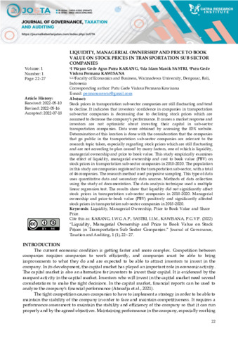Wayan, Gede Agus Putra Karang and Ida, Idam Manik Sastri and Putu, Gede Vishnu Permana Kawisana (2022) Liquidity, managerial ownership and price to book value on stock prices in transportation sub sector companies. Journal of Governance, Taxation, and Auditing, 1 (1): 4. pp. 22-27. ISSN 2830-6392