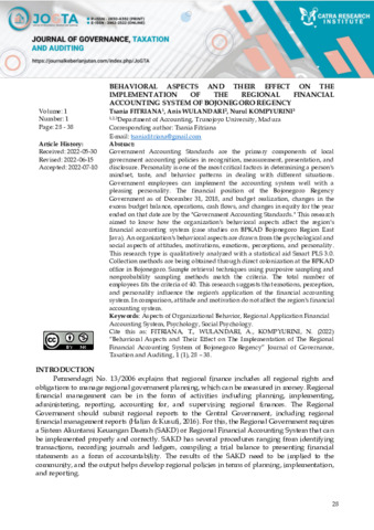 Tsania Fitriana and Anis Wulandari and Nurul Kompyurini (2022) Behavioral aspects and their effect on the implementation of the regional financial accounting system of bojonegoro regency. Journal of Governance, Taxation, and Auditing, 1 (1): 5. pp. 28-38. ISSN 2830-6392