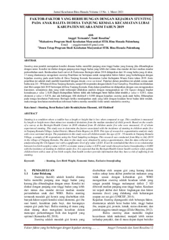 Anggri, Ternando and Santi, Rosalina (2021) Faktor-faktor yang berhubungan dengan kejadian stunting pada anak balita di desa Tanjung Kemala kecamatan Lubai kabupaten Muara Enim Tahun 2019. Jurnal Kesehatan Bina Husada, 13 (1): 3. pp. 12-18. ISSN 1829-9377