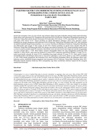 Bella Putri and Martawan Madari (2021) Faktor-faktor yang berhubungan dengan penggunaan alat Kontrasepsi Intra Uterine Device (IUD) di Puskesmas Talang Ratu Palembang Tahun 2019. Jurnal Kesehatan Bina Husada, 13 (1): 5. pp. 29-33. ISSN 1829-9377
