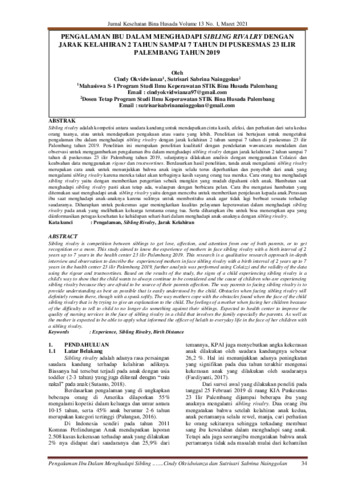 Cindy, Okvidwianza and Sutrisari Sabrina, Nainggolan (2021) Pengalaman ibu dalam menghadapi sibling rivalry dengan jarak kelahiran 2 tahun sampai 7 tahun di Puskesmas 23 ilir Palembang tahun 2019. Jurnal Kesehatan Bina Husada, 13 (1): 6. pp. 34-40. ISSN 1829-9377