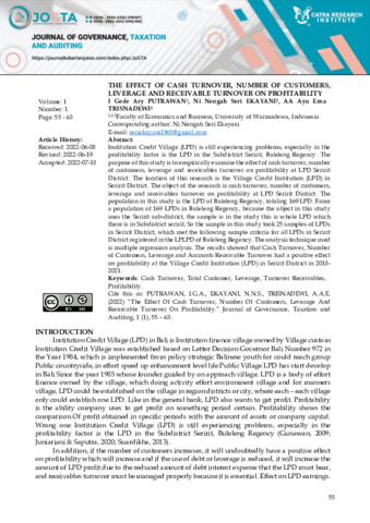 I Gede Ary Putrawan and Ni Nengah Seri Ekayani and Aa Ayu Erna Trisnadew (2022) The effect of cash turnover, number of customers, leverage and receivable turnover on profitability. Journal of Governance, Taxation, and Auditing, 1 (1): 8. pp. 55-63. ISSN 2830-6392