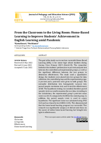 Kamaliasari and Nurbianta (2022) From the classroom to the living room: home-based learning to improve students’ achievement in english learning amid pandemic. Journal of pedagogy and education science (JPES), 1 (1): 2. pp. 12-21. ISSN 2962-5777