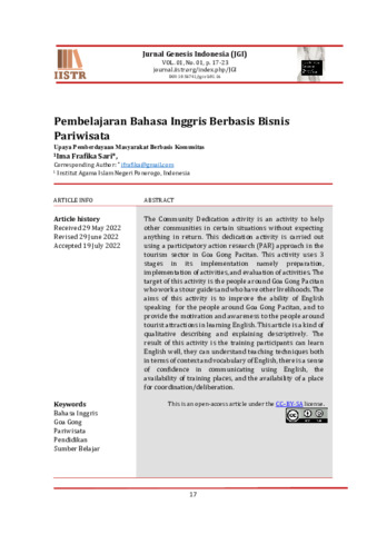 Ima Frafika Sari (2022) Pembelajaran bahasa Inggris berbasis bisnis pariwisata : upaya pemberdayaan masyarakat berbasis komunitas. Jurnal Genesis Indonesia (JGI), 1 (1): 3. pp. 17-23. ISSN 2962-5750