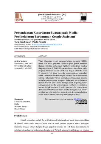 Arip Nurahman and Pandu Pribadi (2022) Pemanfaatan kecerdasan buatan pada media pembelajaran berbantuan google assistant : penelitian tindakan kelas pada materi Hukum Newton. Jurnal Genesis Indonesia (JGI), 1 (1): 4. pp. 24-32. ISSN 2962-5750