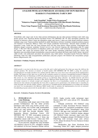 Indri, Paradillah and Endah Widya, Purnamasari (2021) Analisis penilaian program ASI eksklusif di Puskesmas Makrayu Palembang Tahun 2019. Jurnal Kesehatan Bina Husada, 13 (4): 1. pp. 116-120. ISSN 1829-9377