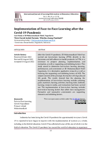 Dewi Sarah Indah, Harumi and Dholina Inang, Pambudi (2022) Implementation of face-to-face learning after the Covid-19 pandemic: case study at SD Muhammadiyah Pakel, Yogyakarta. International Journal of Learning Reformation in Elementary Education, 1 (1): 2. pp. 12-20. ISSN 2961-9092