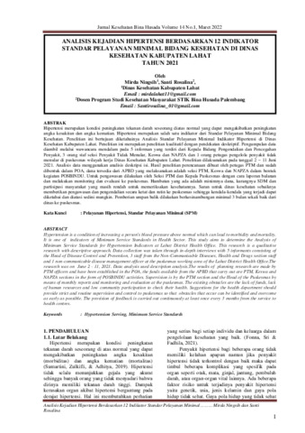 Mirda, Ningsih and Santi, Rosalina (2022) Analisis kejadian hipertensi berdasarkan 12 indikator standar pelayanan minimal bidang kesehatan di dinas kesehatan Kabupaten Lahat tahun 2021. Jurnal Kesehatan Bina Husada, 14 (1): 3. pp. 11-15. ISSN 1829-9377