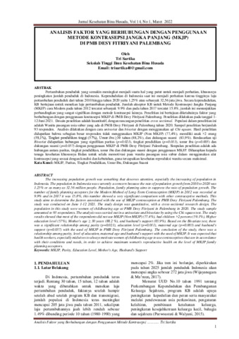 Tri, Sartika (2022) Analisis faktor yang berhubungan dengan penggunaan Metode Kontrasepsi Jangka Panjang (MKJP) di PMB Desy Fitriyani Palembang. Jurnal Kesehatan Bina Husada, 14 (1): 6. pp. 34-37. ISSN 1829-9377