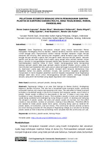 Rama Indera, Kusuma and Enden, Mina and Woelandari, Fathonah and Restu, Wigati and Rifky, Ujianto and Arief, Budiman and Nabila Lita, Aulia (2022) Pelatihan ecobrick sebagai upaya penanganan sampah plastik di Kampung Karang Mulya, Desa Tegalwangi, Menes, Pandeglang. Civil Engineering for Community Development, 1 (1): 4. pp. 23-30. ISSN 2962-0163