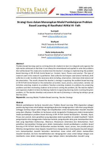 Sumiyati, Sumiyati and Shofiyati, Shofiyati and Naila, Ismiyatussulha (2022) Strategi guru dalam menerapkan model pembelajaran Problem Based Learning di Raudhatul Athfal Al- Fath. Tinta Emas: Jurnal Pendidikan Islam Anak Usia Dini, 1 (1): 1. pp. 1-16. ISSN 2962-3065
