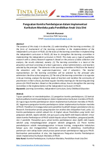 Muniroh, Munawar (2022) Penguatan komite pembelajaran dalam implementasi kurikulum merdeka pada pendidikan anak usia dini. Tinta Emas: Jurnal Pendidikan Islam Anak Usia Dini, 1 (1): 6. pp. 65-72. ISSN 2962-3065