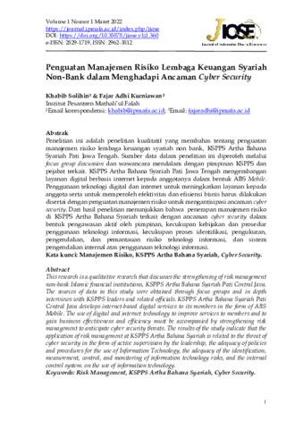 Khabib, Solihin and Fajar Adhi, Kurniawan (2022) Penguatan manajemen risiko lembaga keuangan syariah non-bank dalam menghadapi ancaman cyber security. Journal of Indonesian Sharia Economics, 1 (1): 1. pp. 1-20. ISSN 2962-3812